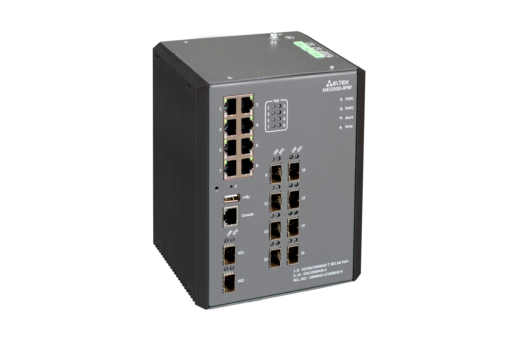 Коммутатор оснащен восемью гигабитными портами 10/100/1000BASE-T с поддержкой PoE/PoE+, обеспечивающими электропитание подключаемых устройств. Кроме того, модель MES3500I-8P8F включает в себя восемь портов 100BASE-FX/1000BASE-X для установки трансиверов SFP и два порта 1000BASE-X/10GBASE-R для установки трансиверов SFP или SFP+, что позволяет гибко настраивать конфигурацию сети.